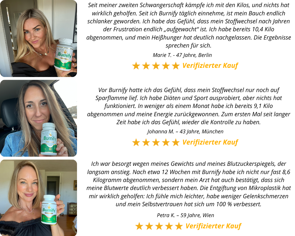 Wir sind so überzeugt, dass Sie mit Burnify großartige Ergebnisse erzielen werden, dass wir es mit einer 100%igen Zufriedenheitsgarantie für 60 Tage absichern. Bereits nach wenigen Tagen der Anwendung können Sie mehr Energie, ein leichteres Körpergefühl und ein verbessertes Wohlbefinden bemerken. Viele Anwender berichten außerdem von einem reduzierten Hungergefühl und sichtbaren Veränderungen auf der Waage. Sollten Sie nach mehreren Wochen oder sogar Monaten nicht zufrieden sein, erstatten wir Ihnen den gesamten Kaufpreis zurück – ohne Risiko für Sie. Dieses Mal haben Sie die Kontrolle über Ihren Körper und Ihr Wohlbefinden.